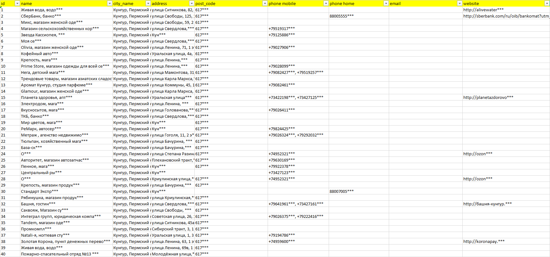 База компаний Кунгур, вся РФ в формате Excel с эл. почтами, телефонами, сайтами, ссылками на соц сети, координатами и другой информацией. Скачайте демо версию, чтобы ознакомиться с данными.