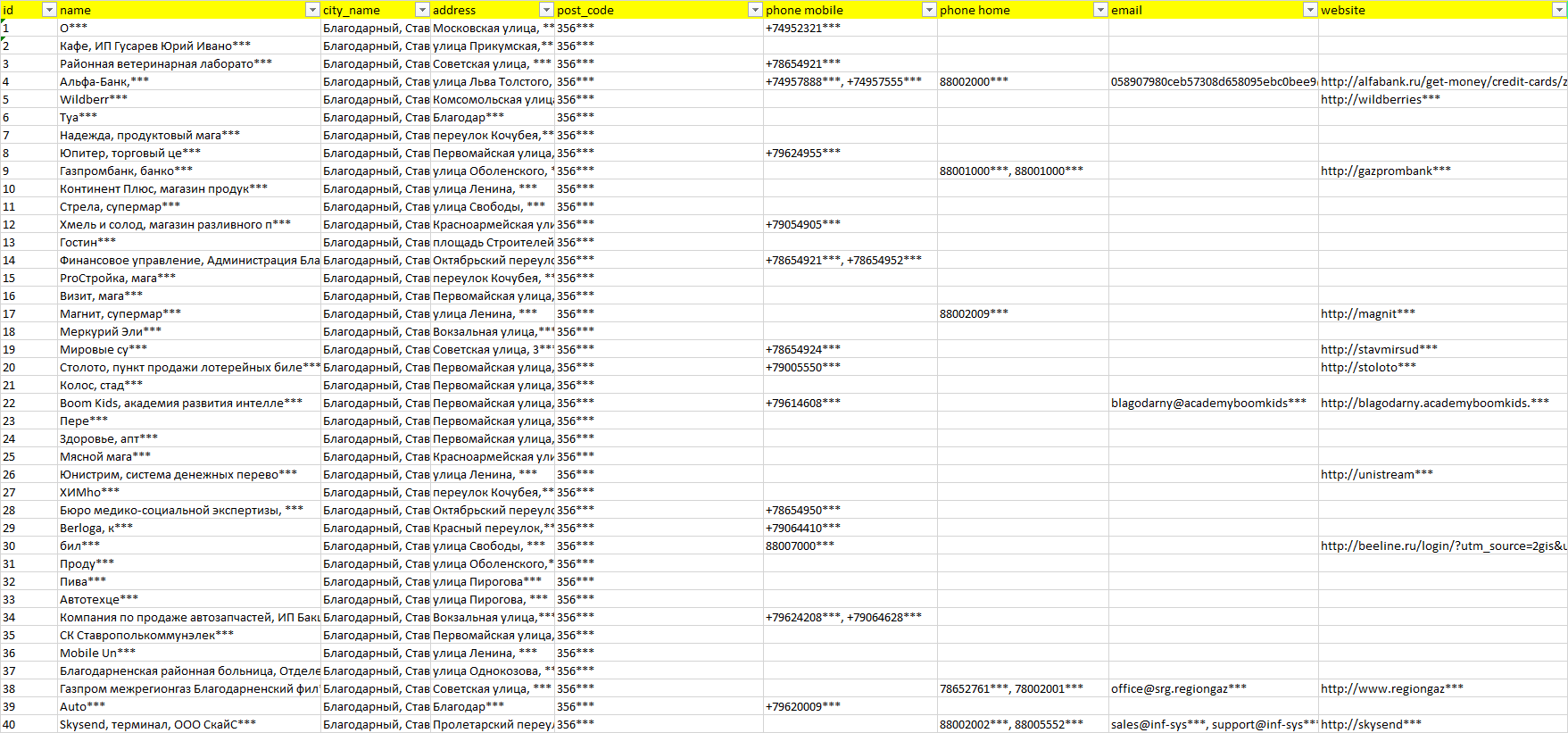 База компаний Благодарный, вся РФ в формате Excel с эл. почтами, телефонами, сайтами, ссылками на соц сети, координатами и другой информацией. Скачайте демо версию, чтобы ознакомиться с данными.