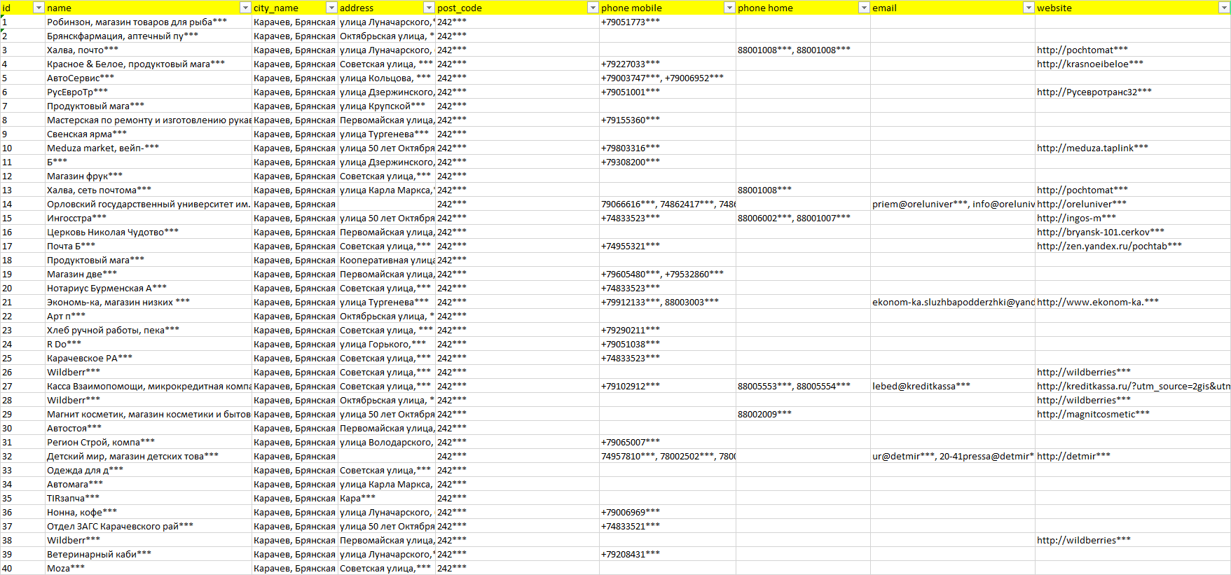 База организаций Карачев, вся Россия в формате Excel с эл. почтами, телефонами, сайтами, ссылками на соц сети, координатами и другой информацией. Скачайте демо версию, чтобы ознакомиться с данными.
