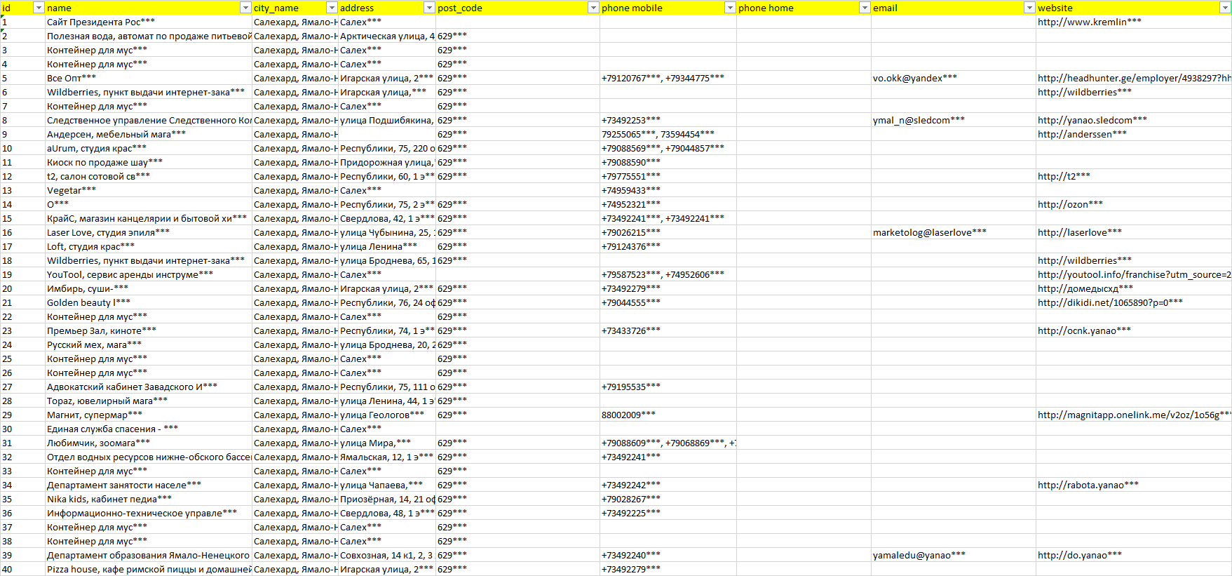 База организаций Салехард, вся Россия в формате Excel с эл. почтами, телефонами, сайтами, ссылками на соц сети, координатами и другой информацией. Скачайте демо версию, чтобы ознакомиться с данными.