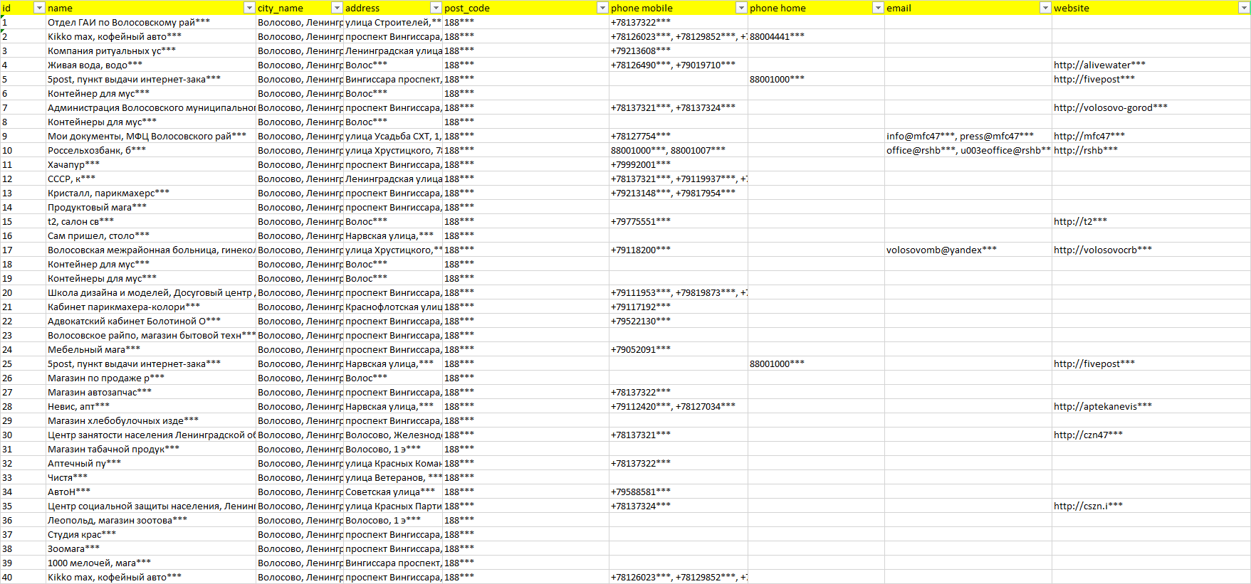 База компаний Волосово, вся РФ в формате Excel с эл. почтами, телефонами, сайтами, ссылками на соц сети, координатами и другой информацией. Скачайте демо версию, чтобы ознакомиться с данными.