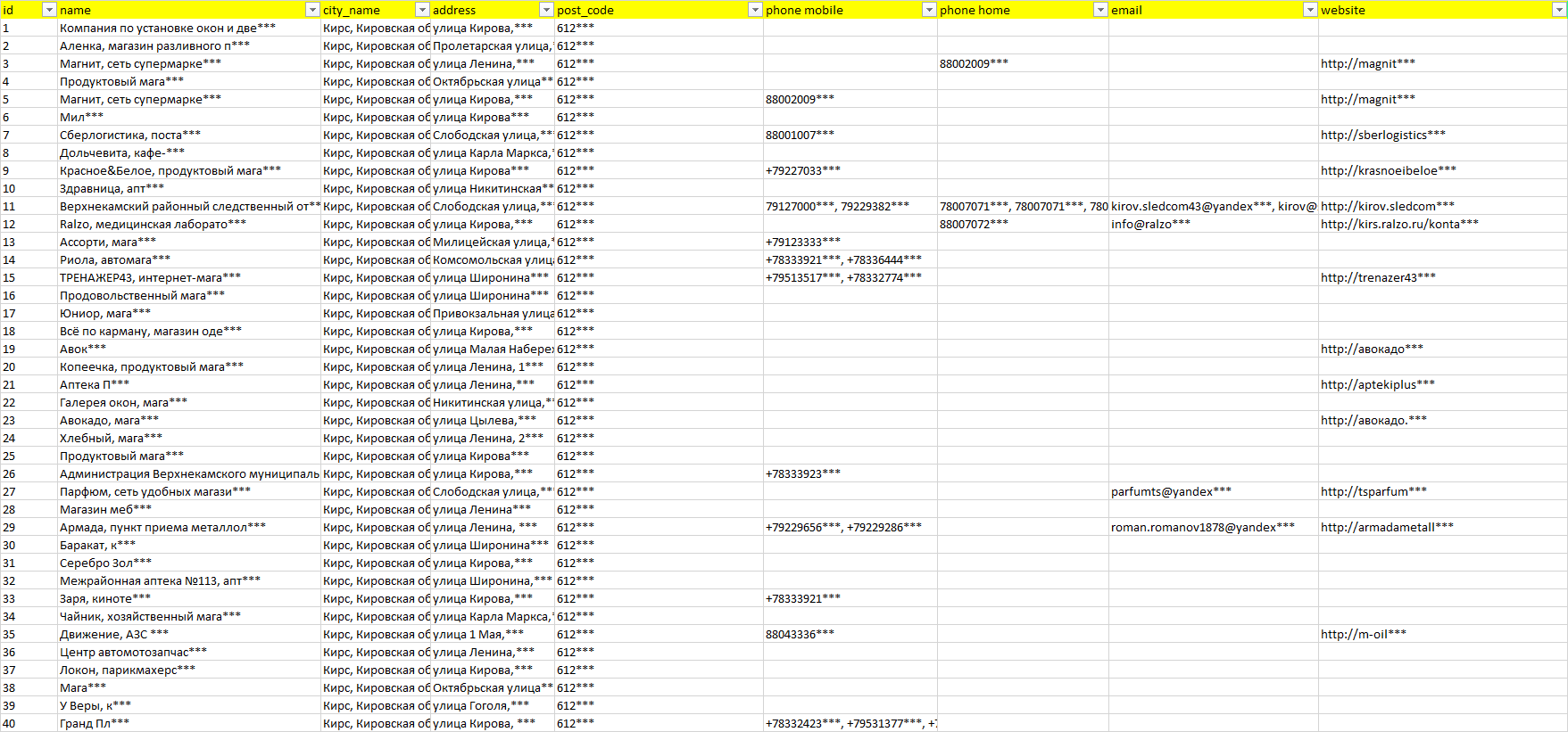 База компаний Кирс, вся РФ в формате Excel с эл. почтами, телефонами, сайтами, ссылками на соц сети, координатами и другой информацией. Скачайте демо версию, чтобы ознакомиться с данными.