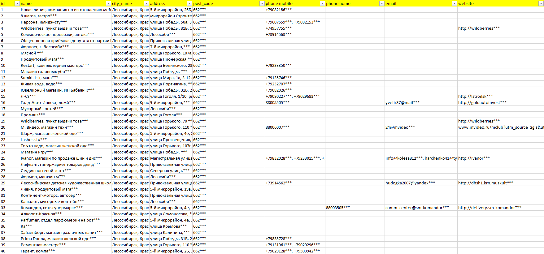 База организаций Лесосибирск, вся Россия в формате Excel с эл. почтами, телефонами, сайтами, ссылками на соц сети, координатами и другой информацией. Скачайте демо версию, чтобы ознакомиться с данными.