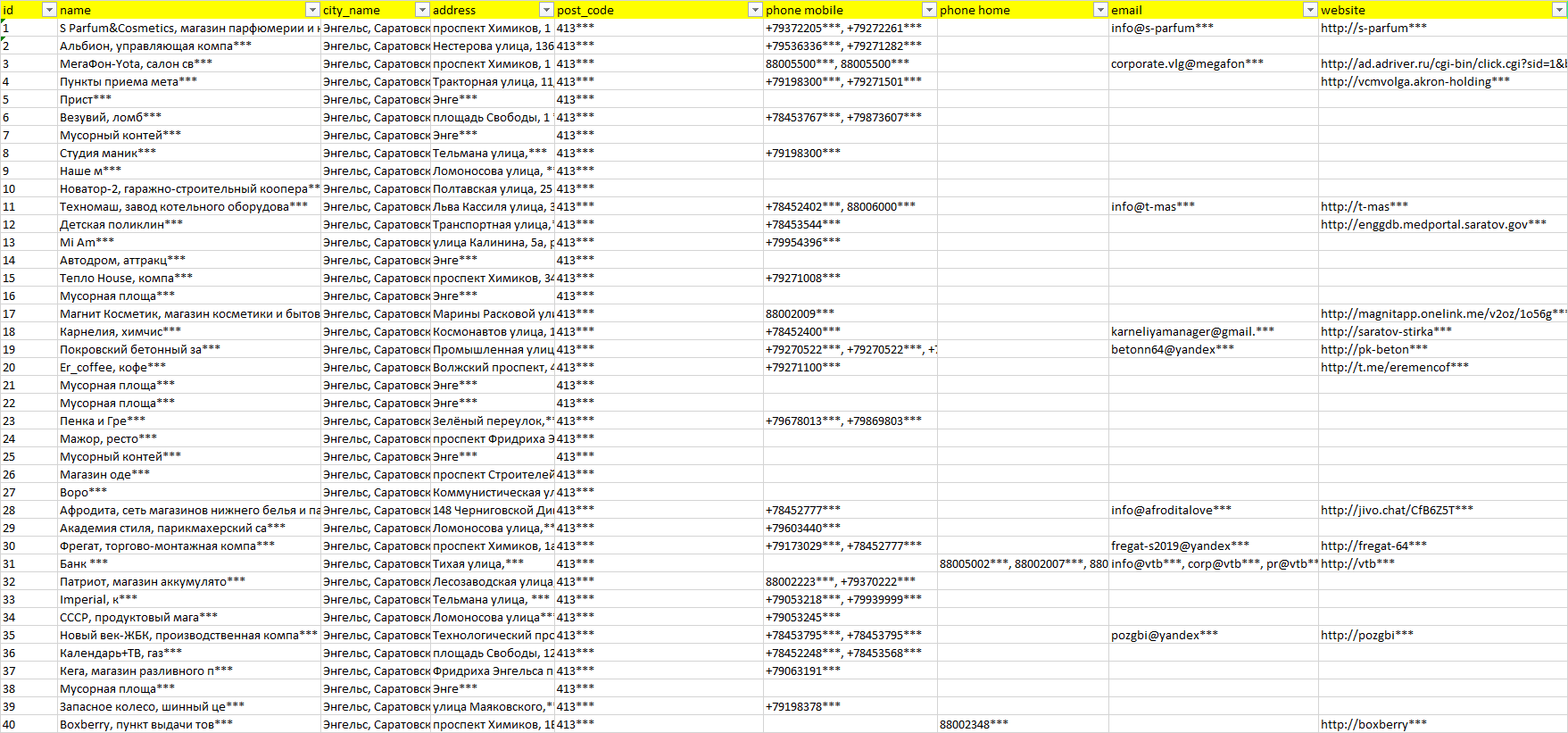 База компаний Энгельс, вся РФ в формате Excel с эл. почтами, телефонами, сайтами, ссылками на соц сети, координатами и другой информацией. Скачайте демо версию, чтобы ознакомиться с данными.