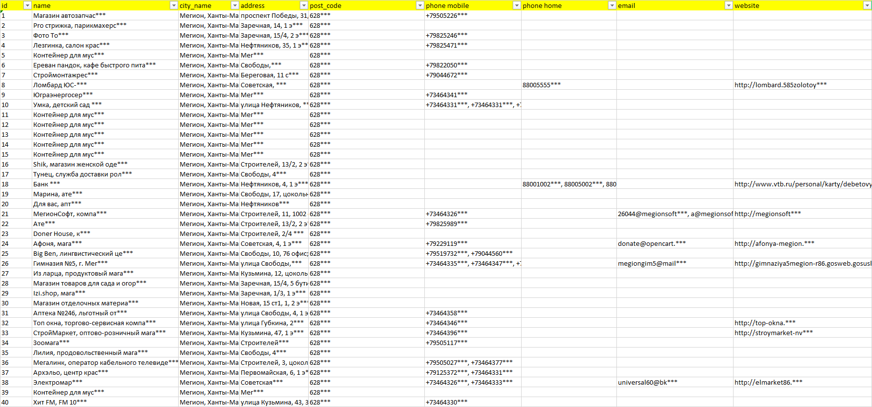 База компаний Мегион, вся РФ в формате Excel с эл. почтами, телефонами, сайтами, ссылками на соц сети, координатами и другой информацией. Скачайте демо версию, чтобы ознакомиться с данными.