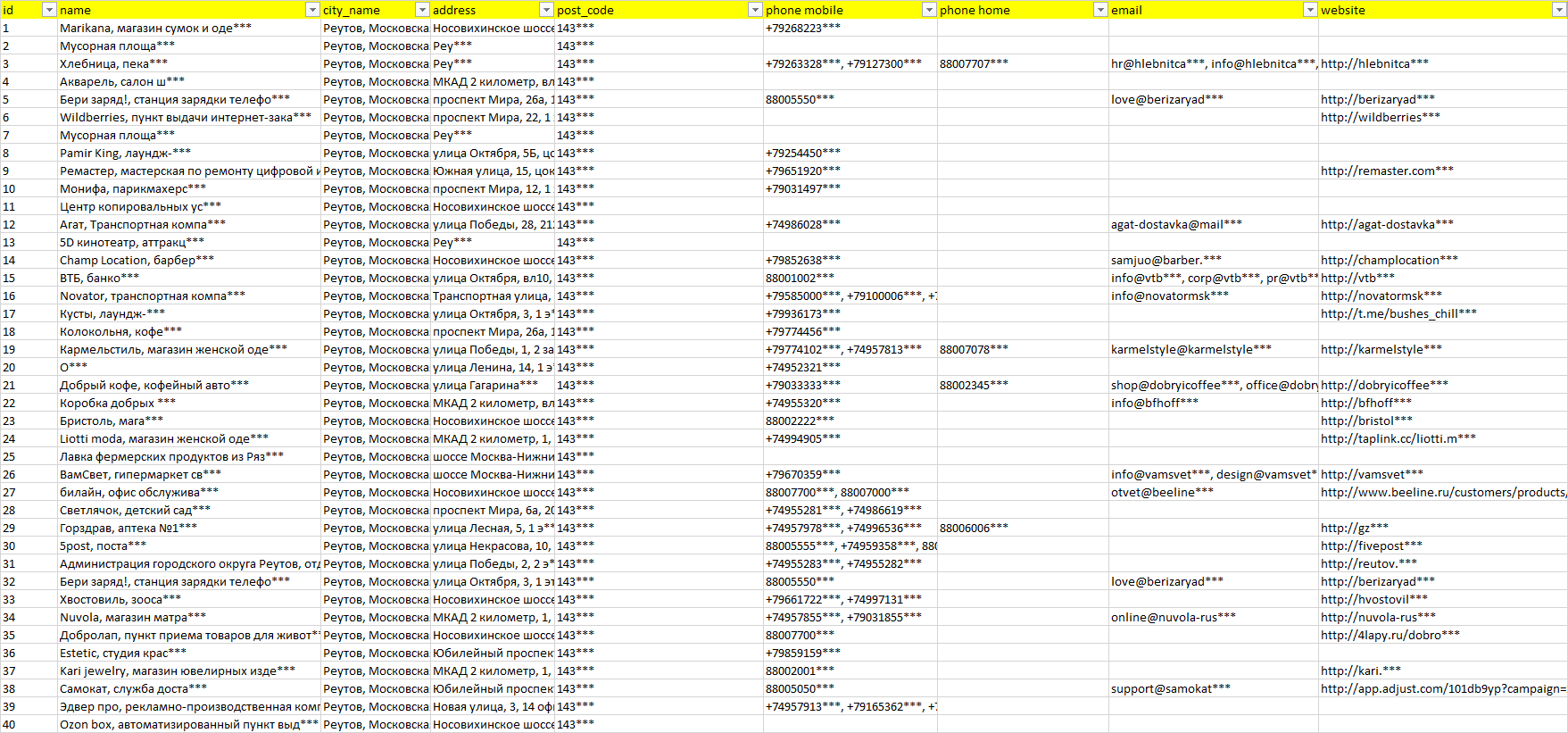 База компаний Реутов, вся РФ в формате Excel с эл. почтами, телефонами, сайтами, ссылками на соц сети, координатами и другой информацией. Скачайте демо версию, чтобы ознакомиться с данными.