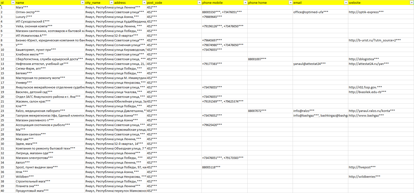 База компаний Янаул, вся РФ в формате Excel с эл. почтами, телефонами, сайтами, ссылками на соц сети, координатами и другой информацией. Скачайте демо версию, чтобы ознакомиться с данными.