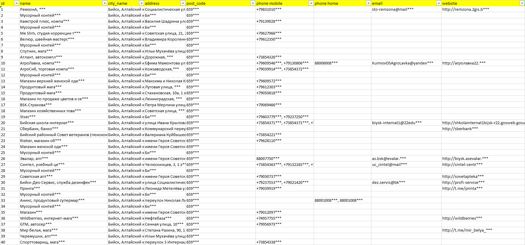 База организаций Бийск, вся Россия в формате Excel с эл. почтами, телефонами, сайтами, ссылками на соц сети, координатами и другой информацией. Скачайте демо версию, чтобы ознакомиться с данными.