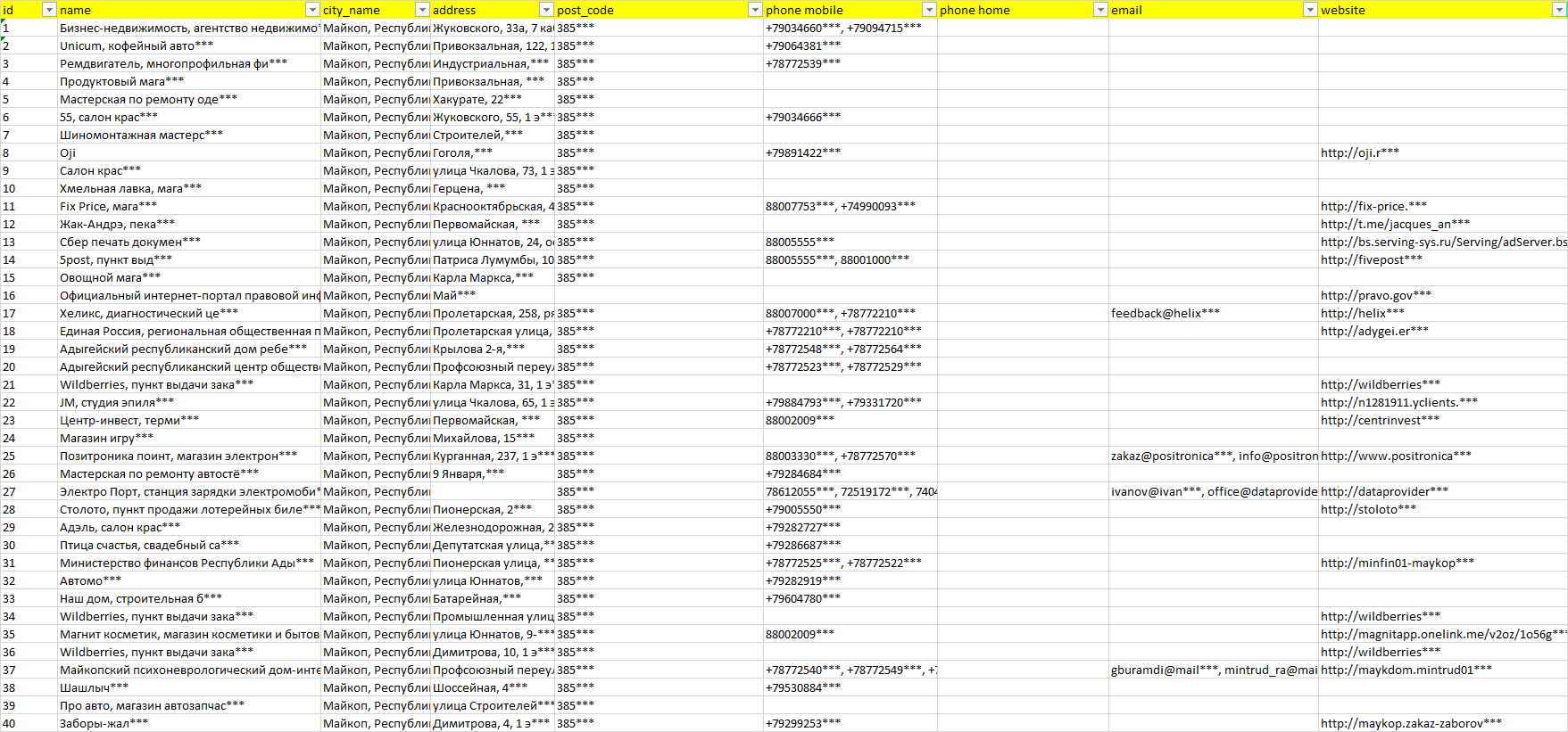 База организаций Майкоп, вся Россия в формате Excel с эл. почтами, телефонами, сайтами, ссылками на соц сети, координатами и другой информацией. Скачайте демо версию, чтобы ознакомиться с данными.