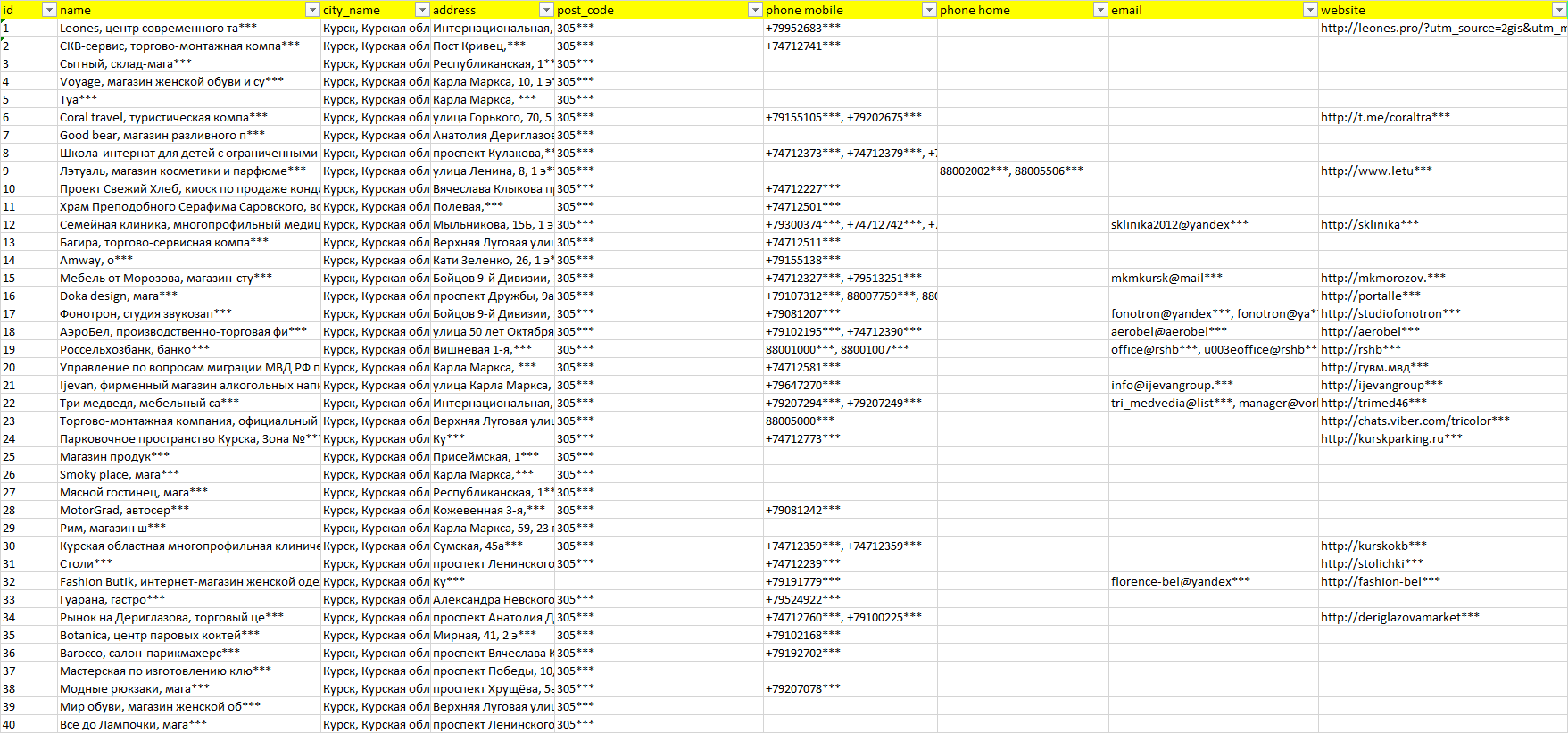 База организаций Курск, вся Россия в формате Excel с эл. почтами, телефонами, сайтами, ссылками на соц сети, координатами и другой информацией. Скачайте демо версию, чтобы ознакомиться с данными.