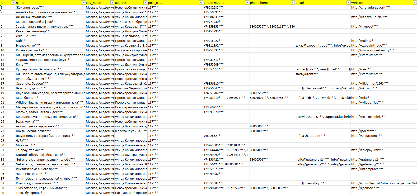База организаций Москвы, вся Россия в формате Excel с эл. почтами, телефонами, сайтами, ссылками на соц сети, координатами и другой информацией. Скачайте демо версию, чтобы ознакомиться с данными.