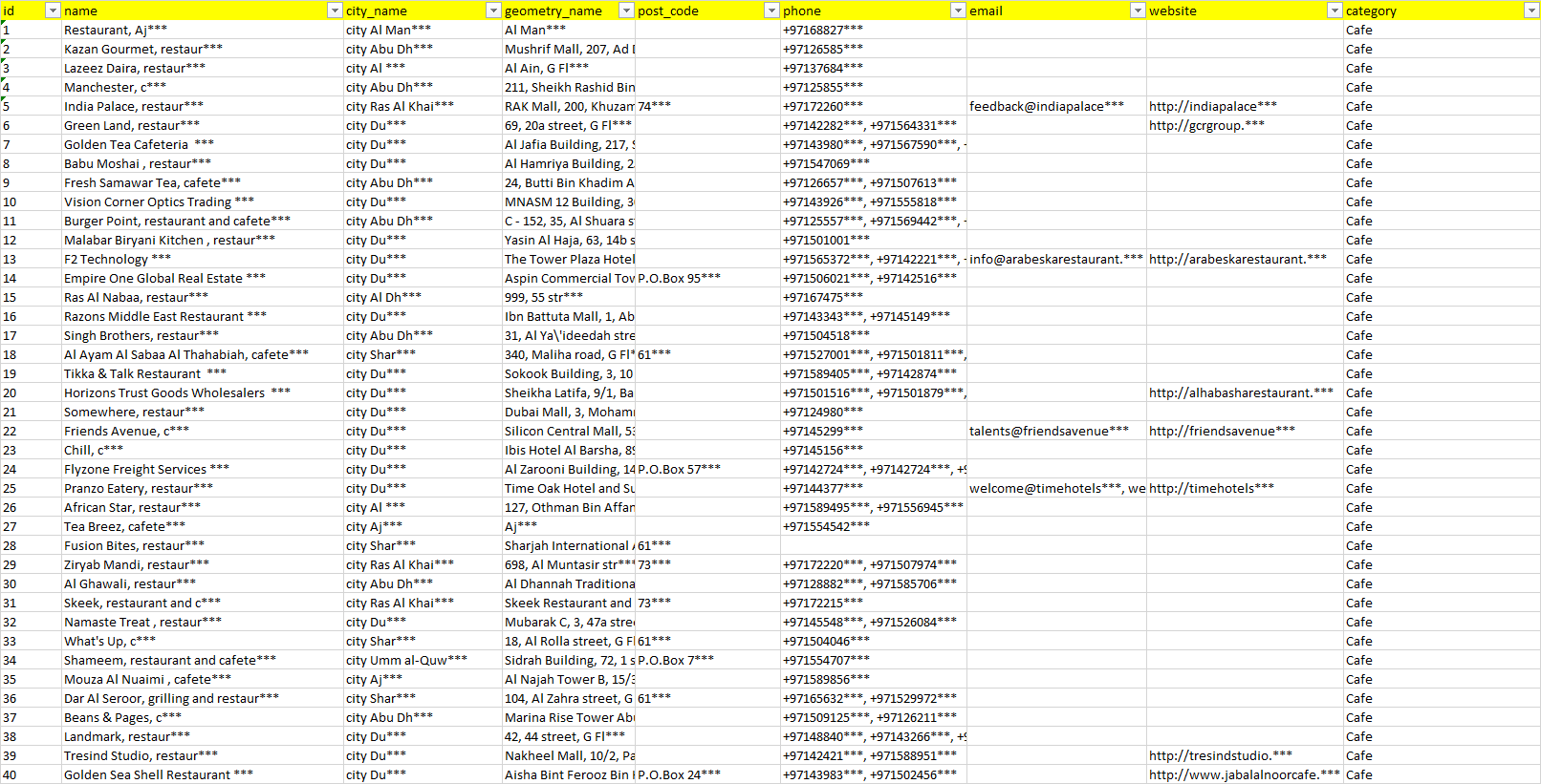 База организаций кафе Объединённые Арабские Эмираты в формате Excel с эл. почтами, телефонами, сайтами, ссылками на соц сети, координатами и другой информацией. Скачайте демо версию, чтобы ознакомиться с данными.