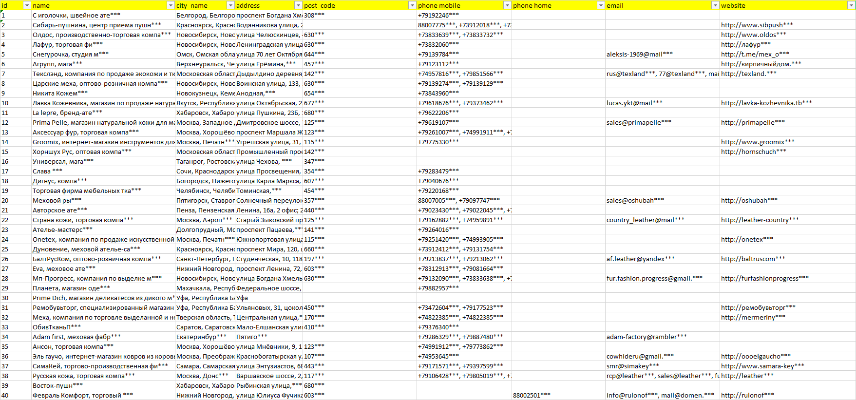 База компаний меховое и кожаное сырьё, вся РФ в формате Excel с эл. почтами, телефонами, сайтами, ссылками на соц сети, координатами и другой информацией. Скачайте демо версию, чтобы ознакомиться с данными.