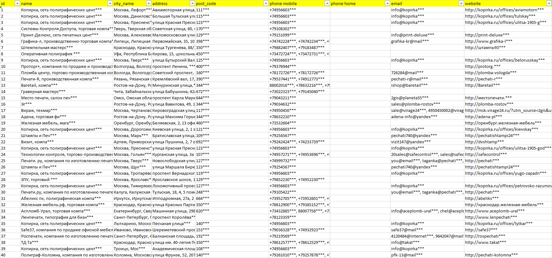 Мы автоматически собираем такие данные с различных открытых источников, обрабатываем, структурирует и упорядочиваем их, предоставляя пользователю возможность скачать результат в формате Excel. По принципу работы наш сервис аналогичен поисковым системам, таким как Google или Яндекс, но с возможностью экспорта найденной информации в удобном табличном виде.