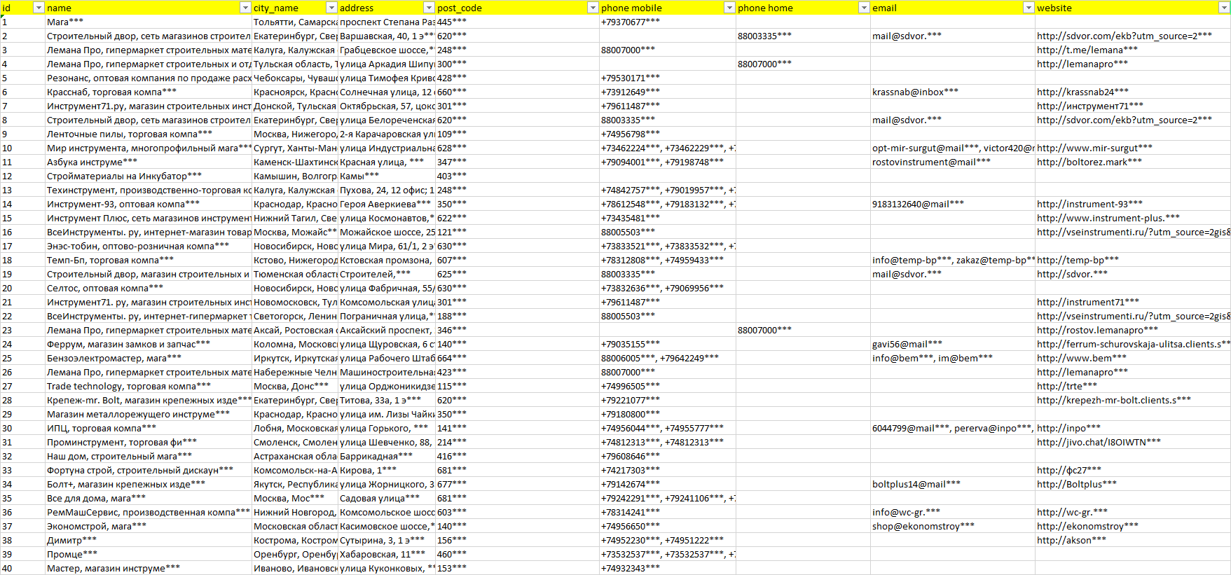 Мы автоматически собираем такие данные с различных открытых источников, обрабатываем, структурирует и упорядочиваем их, предоставляя пользователю возможность скачать результат в формате Excel. По принципу работы наш сервис аналогичен поисковым системам, таким как Google или Яндекс, но с возможностью экспорта найденной информации в удобном табличном виде.
