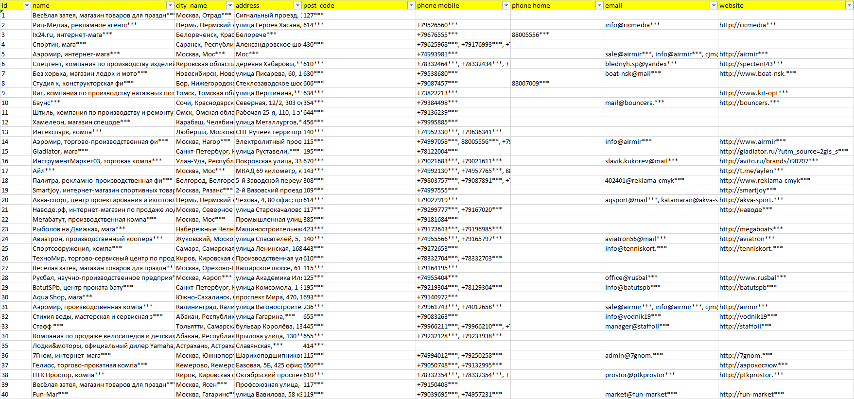 Мы автоматически собираем такие данные с различных открытых источников, обрабатываем, структурирует и упорядочиваем их, предоставляя пользователю возможность скачать результат в формате Excel. По принципу работы наш сервис аналогичен поисковым системам, таким как Google или Яндекс, но с возможностью экспорта найденной информации в удобном табличном виде.