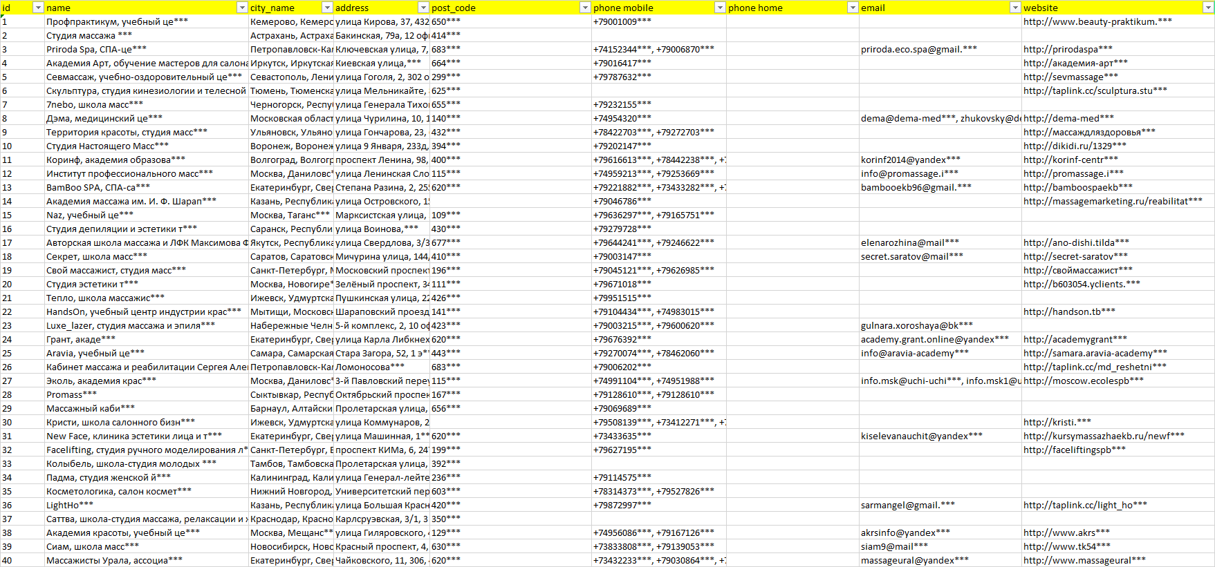 База компаний обучение массажистов, вся РФ в формате Excel с эл. почтами, телефонами, сайтами, ссылками на соц сети, координатами и другой информацией. Скачайте демо версию, чтобы ознакомиться с данными.