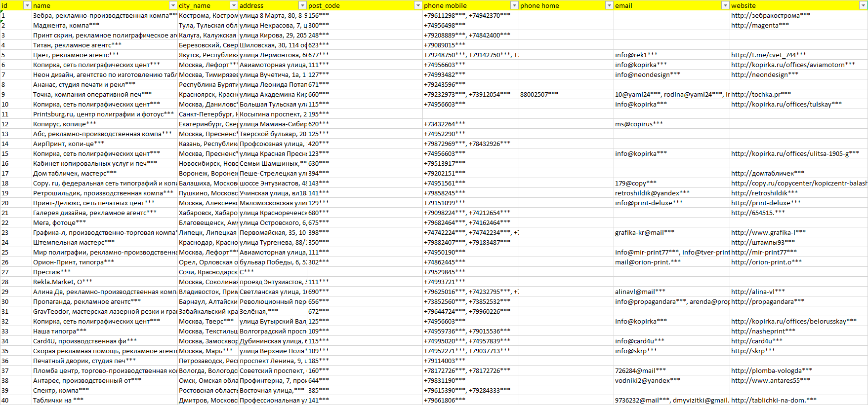 Мы автоматически собираем такие данные с различных открытых источников, обрабатываем, структурирует и упорядочиваем их, предоставляя пользователю возможность скачать результат в формате Excel. По принципу работы наш сервис аналогичен поисковым системам, таким как Google или Яндекс, но с возможностью экспорта найденной информации в удобном табличном виде.