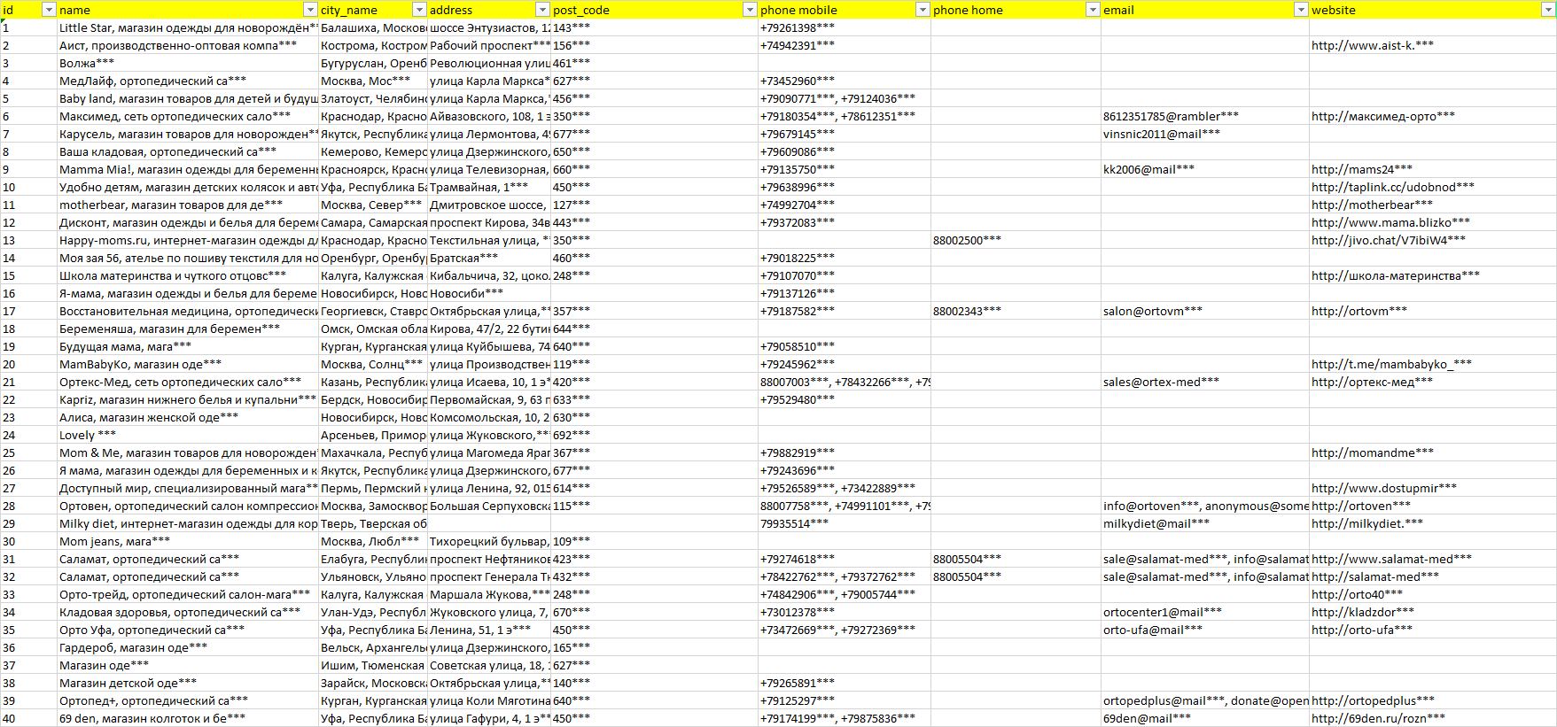 База организаций товары для беременных и кормящих мам, вся Россия в формате Excel с эл. почтами, телефонами, сайтами, ссылками на соц сети, координатами и другой информацией. Скачайте демо версию, чтобы ознакомиться с данными.