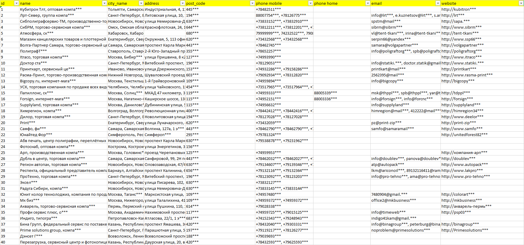 База компаний расходные материалы для полиграфии, вся РФ в формате Excel с эл. почтами, телефонами, сайтами, ссылками на соц сети, координатами и другой информацией. Скачайте демо версию, чтобы ознакомиться с данными.