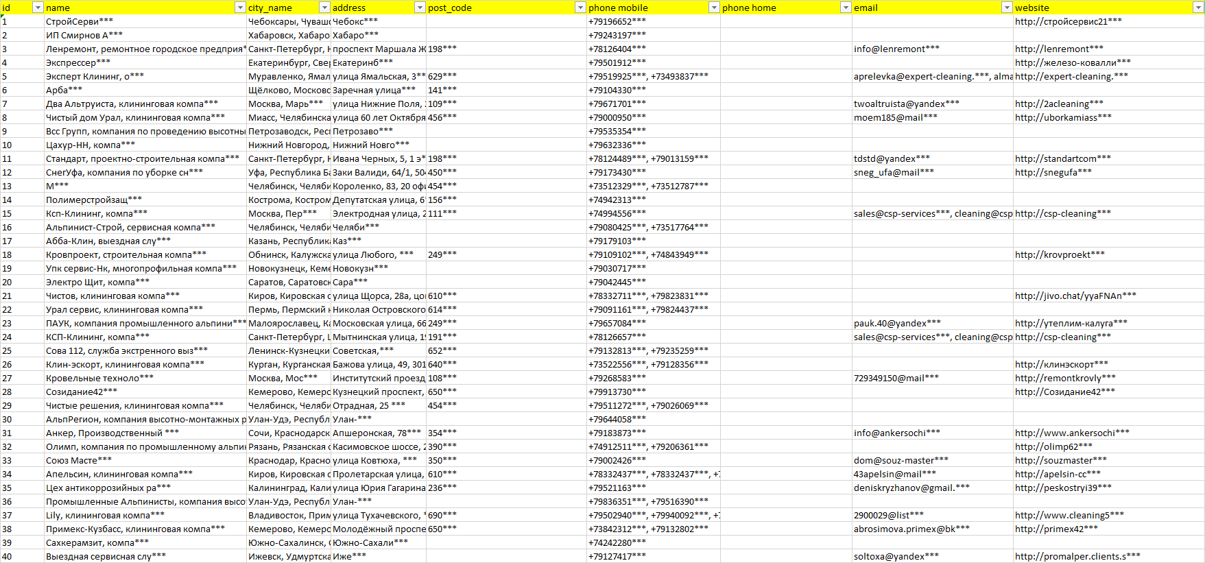 База компаний высотные работы, вся РФ в формате Excel с эл. почтами, телефонами, сайтами, ссылками на соц сети, координатами и другой информацией. Скачайте демо версию, чтобы ознакомиться с данными.