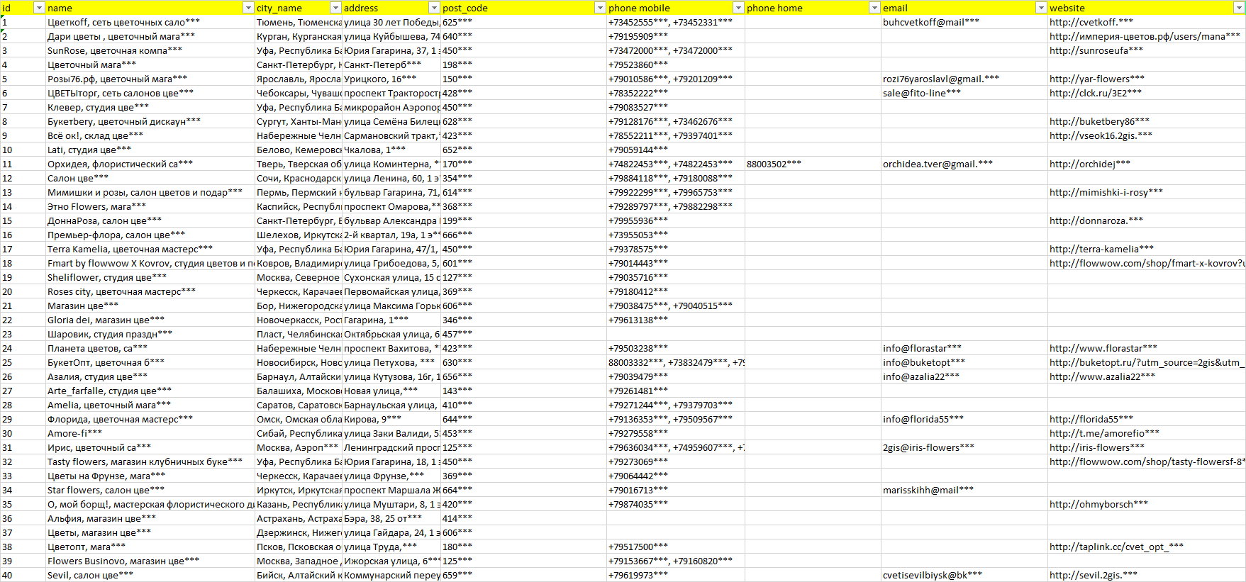 База компаний доставка цветов, вся РФ в формате Excel с эл. почтами, телефонами, сайтами, ссылками на соц сети, координатами и другой информацией. Скачайте демо версию, чтобы ознакомиться с данными.