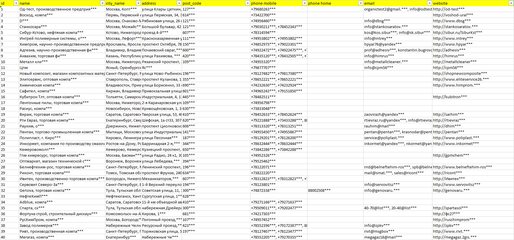 База организаций промышленная химия, вся Россия в формате Excel с эл. почтами, телефонами, сайтами, ссылками на соц сети, координатами и другой информацией. Скачайте демо версию, чтобы ознакомиться с данными.
