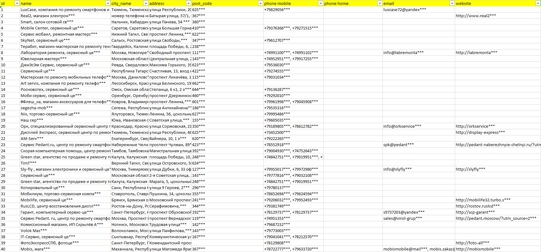 База компаний ремонт телефонов, вся РФ в формате Excel с эл. почтами, телефонами, сайтами, ссылками на соц сети, координатами и другой информацией. Скачайте демо версию, чтобы ознакомиться с данными.