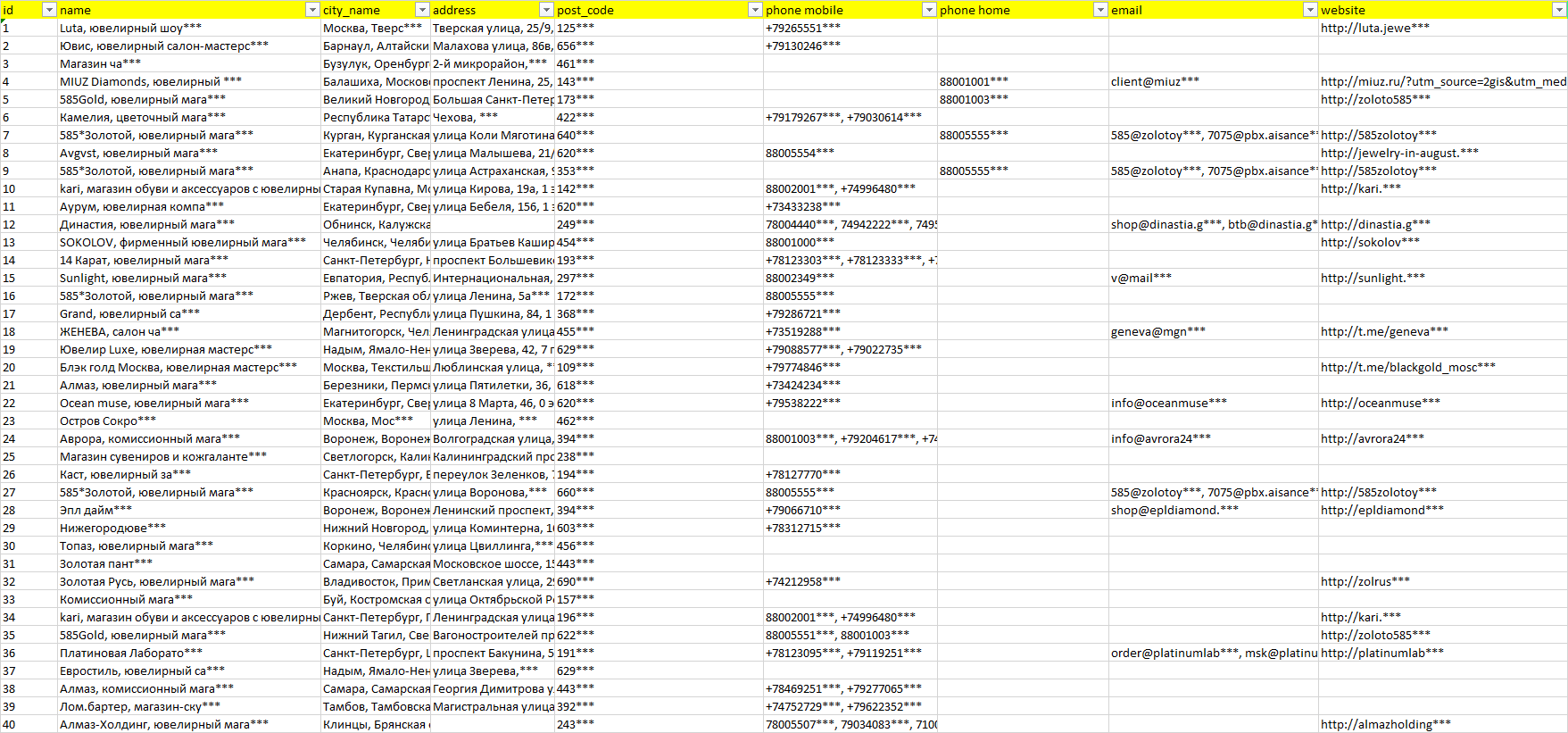 База компаний ювелирные изделия, вся РФ в формате Excel с эл. почтами, телефонами, сайтами, ссылками на соц сети, координатами и другой информацией. Скачайте демо версию, чтобы ознакомиться с данными.