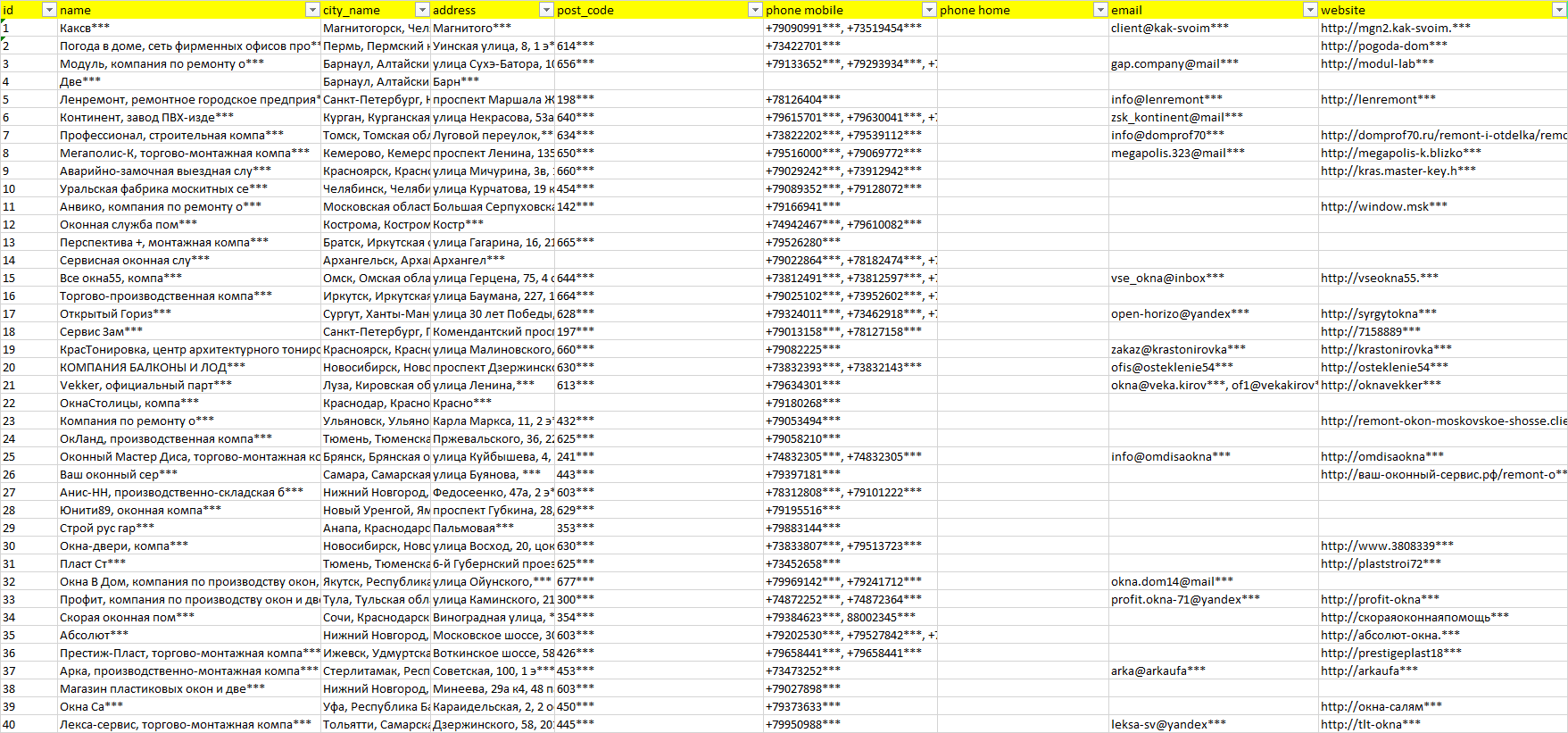 База организаций ремонт окон, вся Россия в формате Excel с эл. почтами, телефонами, сайтами, ссылками на соц сети, координатами и другой информацией. Скачайте демо версию, чтобы ознакомиться с данными.