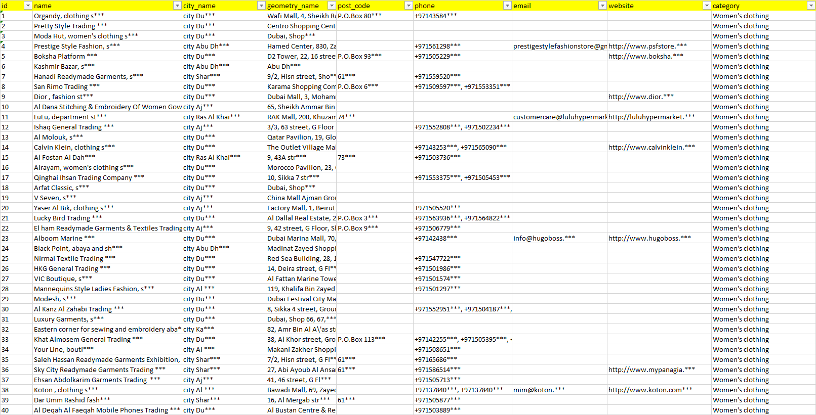 База организаций женская одежда Объединённые Арабские Эмираты в формате Excel с эл. почтами, телефонами, сайтами, ссылками на соц сети, координатами и другой информацией. Скачайте демо версию, чтобы ознакомиться с данными.