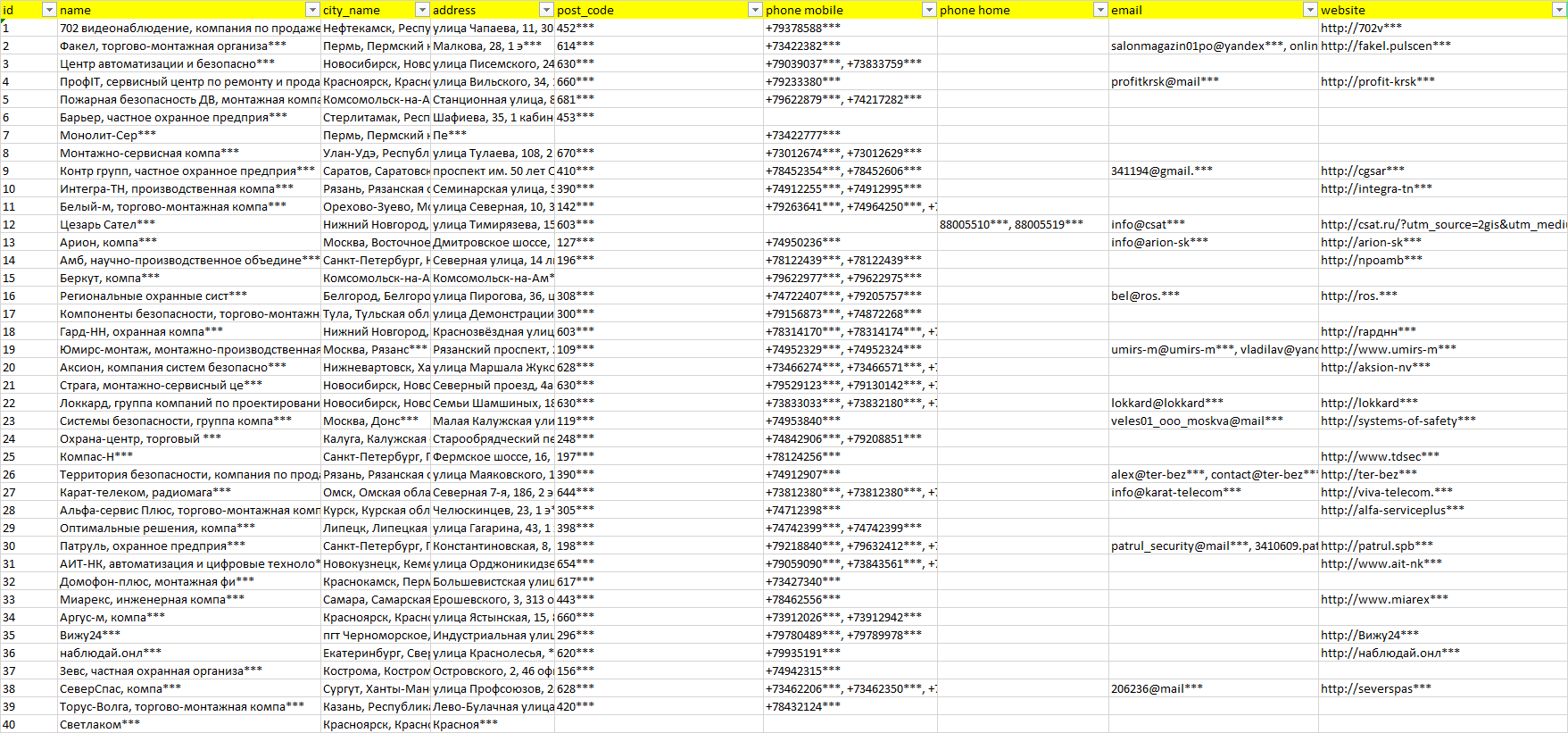 База компаний монтаж охранно-пожарных систем, вся РФ в формате Excel с эл. почтами, телефонами, сайтами, ссылками на соц сети, координатами и другой информацией. Скачайте демо версию, чтобы ознакомиться с данными.