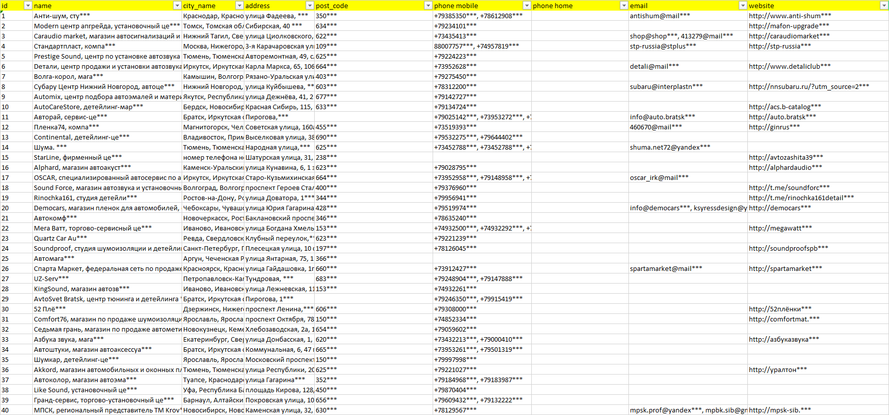 База компаний изоляционные материалы для авто, вся РФ в формате Excel с эл. почтами, телефонами, сайтами, ссылками на соц сети, координатами и другой информацией. Скачайте демо версию, чтобы ознакомиться с данными.