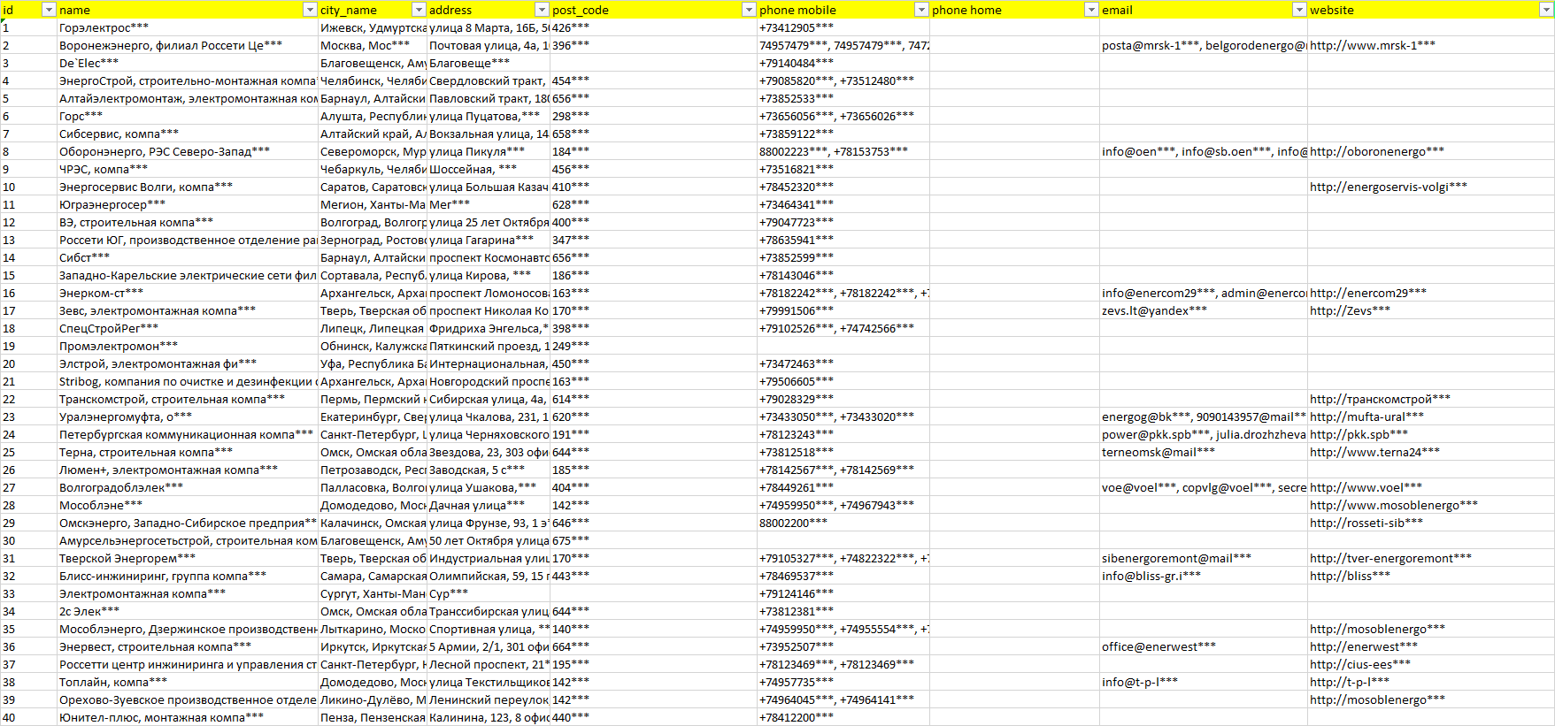 База организаций строительство и обслуживание электросетей, вся Россия в формате Excel с эл. почтами, телефонами, сайтами, ссылками на соц сети, координатами и другой информацией. Скачайте демо версию, чтобы ознакомиться с данными.