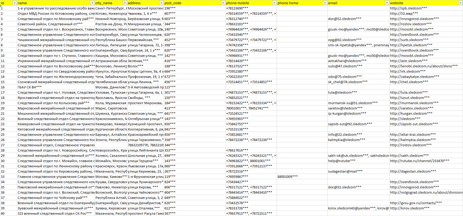 База компаний следственный комитет, вся РФ в формате Excel с эл. почтами, телефонами, сайтами, ссылками на соц сети, координатами и другой информацией. Скачайте демо версию, чтобы ознакомиться с данными.
