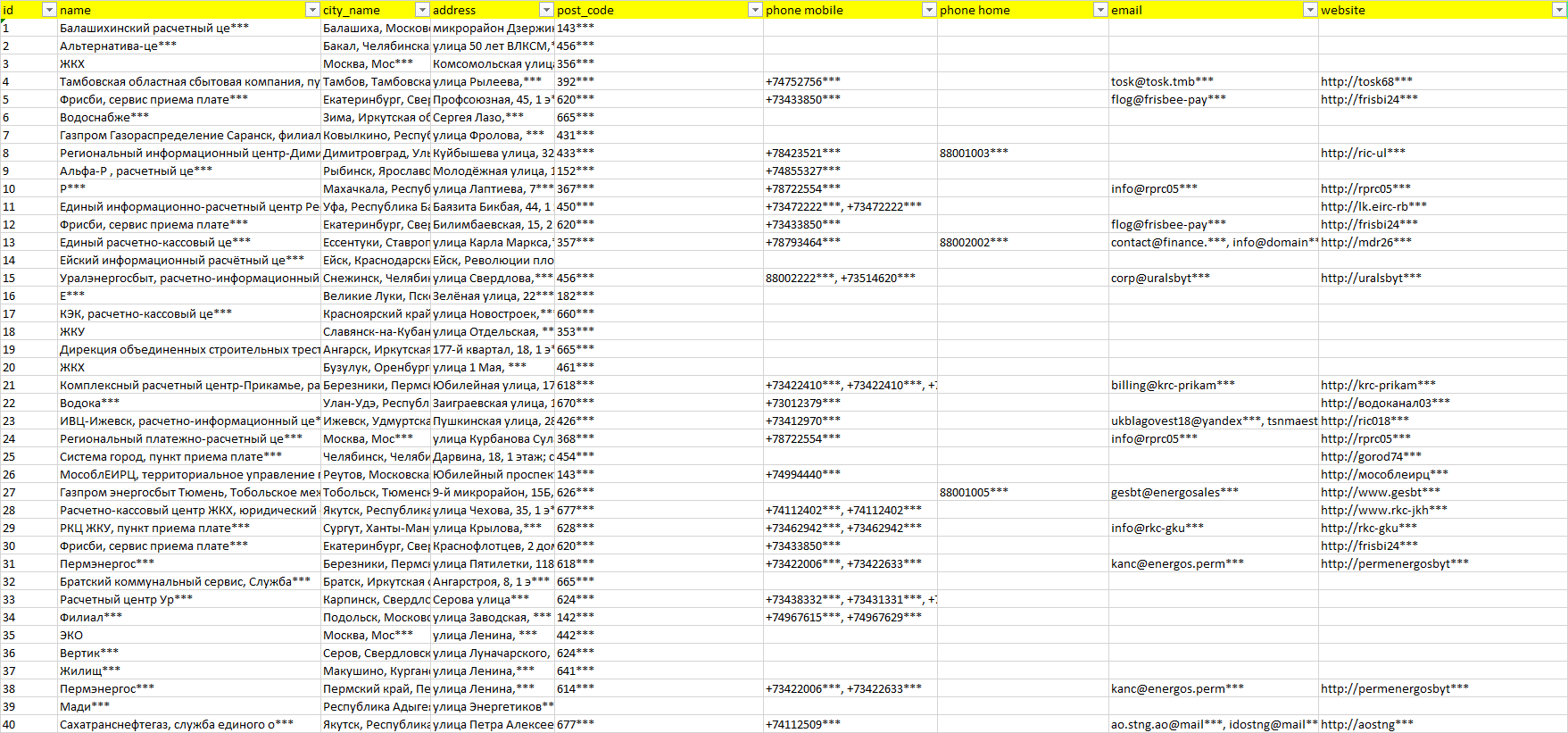 База компаний пункты приёма платежей, вся РФ в формате Excel с эл. почтами, телефонами, сайтами, ссылками на соц сети, координатами и другой информацией. Скачайте демо версию, чтобы ознакомиться с данными.