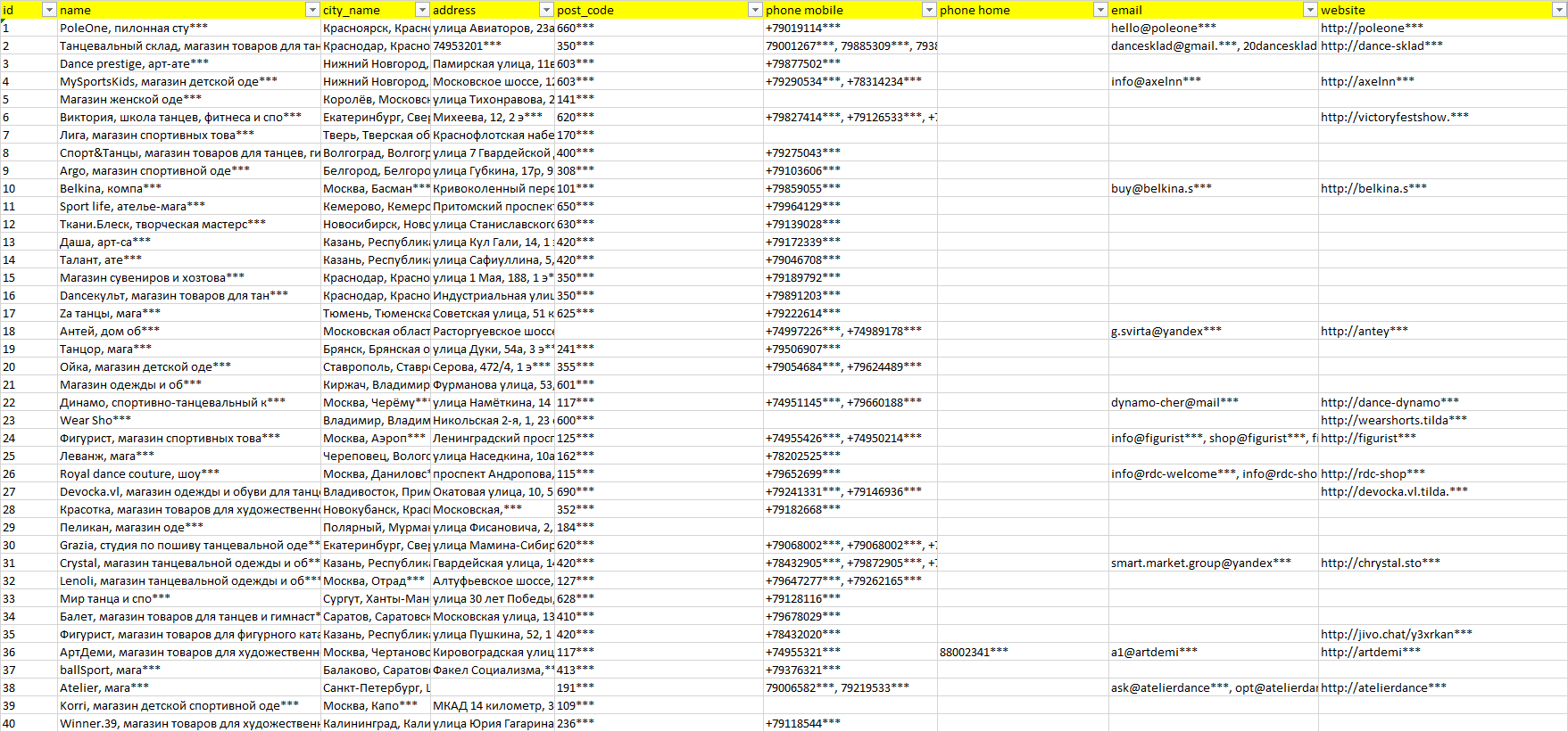 База компаний одежда и обувь для танцев, вся РФ в формате Excel с эл. почтами, телефонами, сайтами, ссылками на соц сети, координатами и другой информацией. Скачайте демо версию, чтобы ознакомиться с данными.