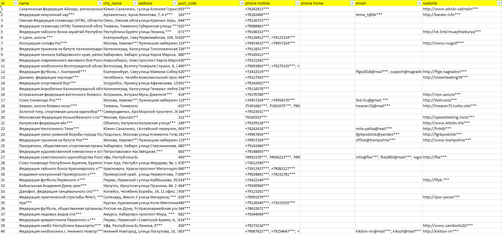 База организаций федерации спорта, вся Россия в формате Excel с эл. почтами, телефонами, сайтами, ссылками на соц сети, координатами и другой информацией. Скачайте демо версию, чтобы ознакомиться с данными.