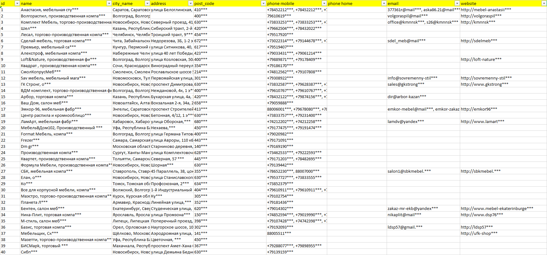 Мы автоматически собираем такие данные с различных открытых источников, обрабатываем, структурирует и упорядочиваем их, предоставляя пользователю возможность скачать результат в формате Excel. По принципу работы наш сервис аналогичен поисковым системам, таким как Google или Яндекс, но с возможностью экспорта найденной информации в удобном табличном виде.
