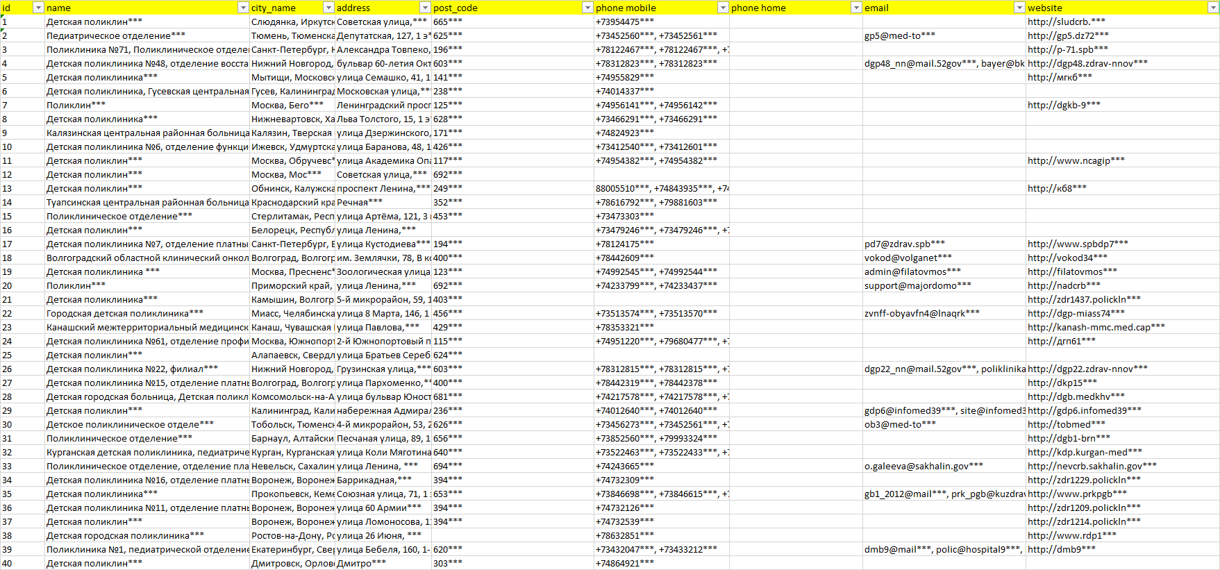 База компаний детские поликлиники, вся РФ в формате Excel с эл. почтами, телефонами, сайтами, ссылками на соц сети, координатами и другой информацией. Скачайте демо версию, чтобы ознакомиться с данными.