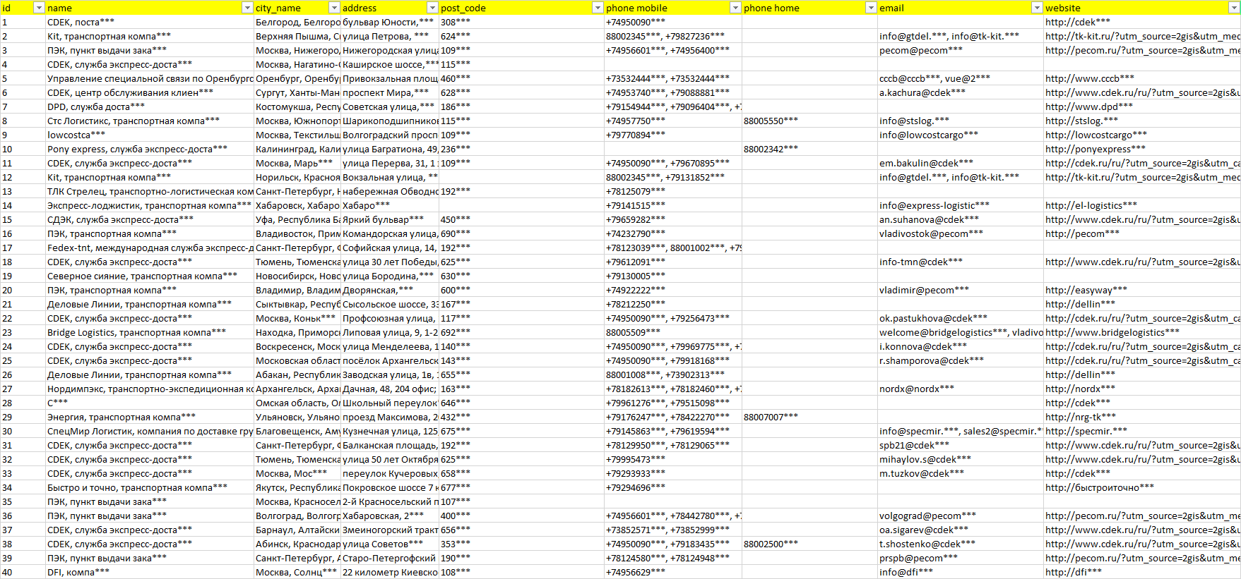 Мы автоматически собираем такие данные с различных открытых источников, обрабатываем, структурирует и упорядочиваем их, предоставляя пользователю возможность скачать результат в формате Excel. По принципу работы наш сервис аналогичен поисковым системам, таким как Google или Яндекс, но с возможностью экспорта найденной информации в удобном табличном виде.