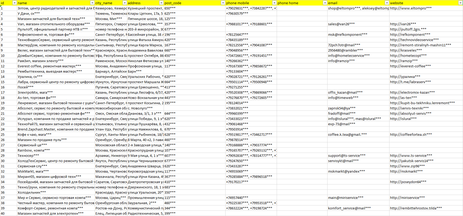 База компаний запчасти для бытовой техники, вся РФ в формате Excel с эл. почтами, телефонами, сайтами, ссылками на соц сети, координатами и другой информацией. Скачайте демо версию, чтобы ознакомиться с данными.