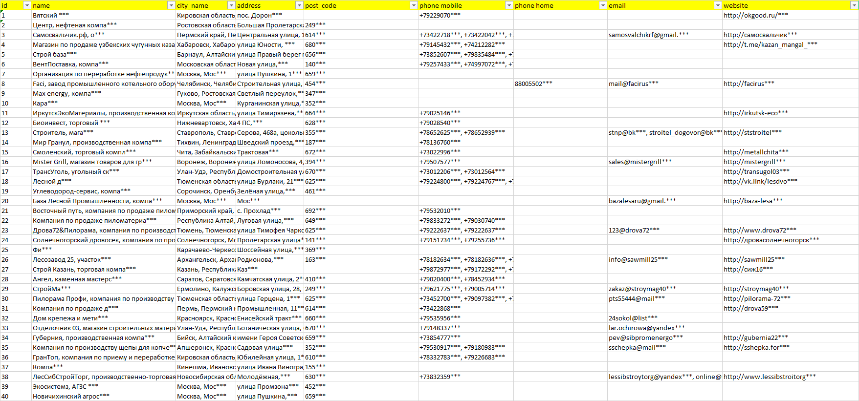 Мы автоматически собираем такие данные с различных открытых источников, обрабатываем, структурирует и упорядочиваем их, предоставляя пользователю возможность скачать результат в формате Excel. По принципу работы наш сервис аналогичен поисковым системам, таким как Google или Яндекс, но с возможностью экспорта найденной информации в удобном табличном виде.