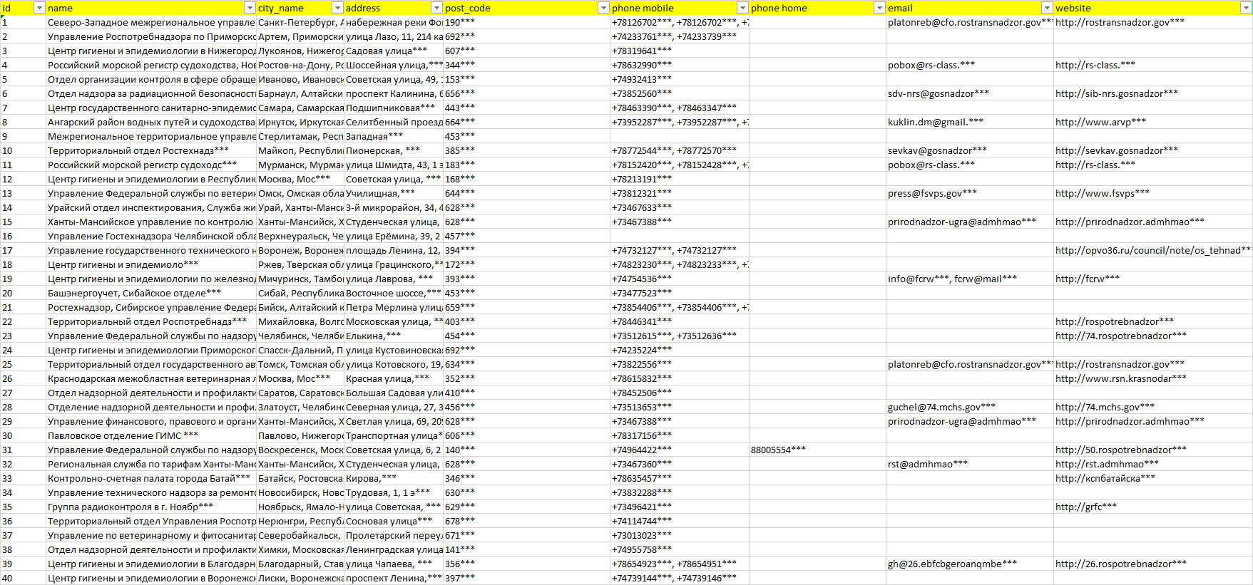 База компаний органы государственного надзора, вся РФ в формате Excel с эл. почтами, телефонами, сайтами, ссылками на соц сети, координатами и другой информацией. Скачайте демо версию, чтобы ознакомиться с данными.