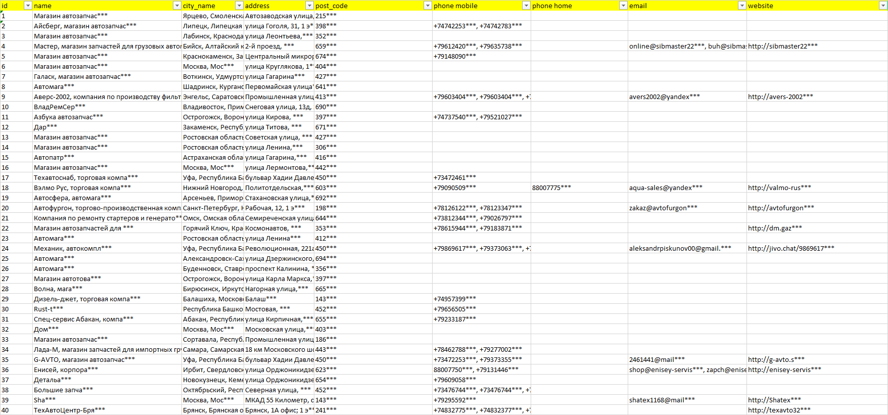 База организаций запчасти для грузовых авто, вся Россия в формате Excel с эл. почтами, телефонами, сайтами, ссылками на соц сети, координатами и другой информацией. Скачайте демо версию, чтобы ознакомиться с данными.