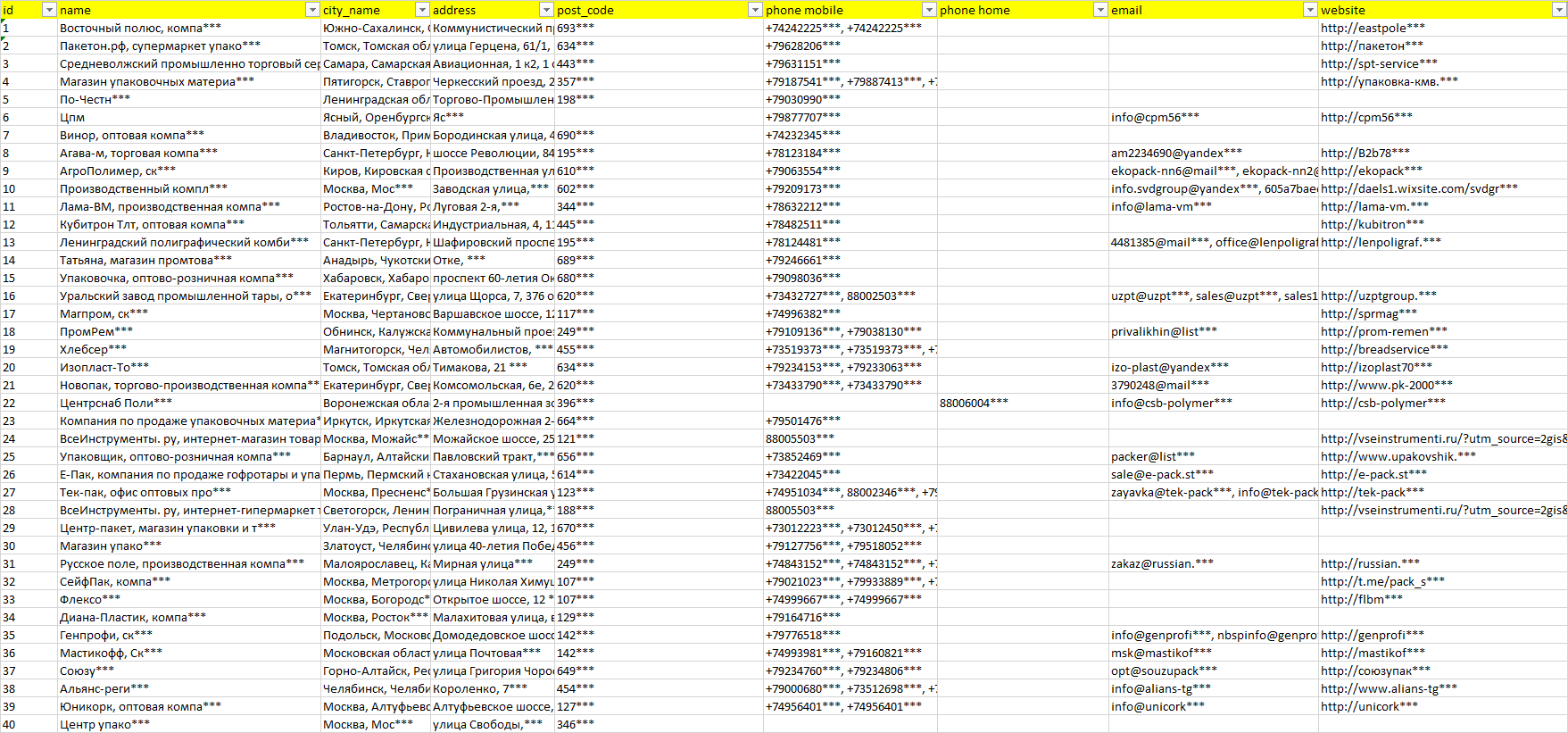 База компаний упаковочные материалы, вся РФ в формате Excel с эл. почтами, телефонами, сайтами, ссылками на соц сети, координатами и другой информацией. Скачайте демо версию, чтобы ознакомиться с данными.