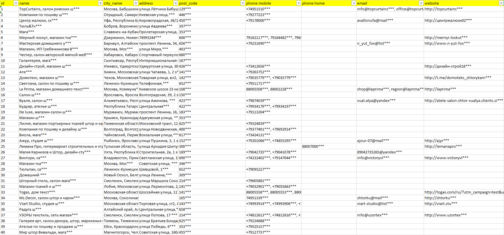База компаний портьерные ткани и шторы, вся РФ в формате Excel с эл. почтами, телефонами, сайтами, ссылками на соц сети, координатами и другой информацией. Скачайте демо версию, чтобы ознакомиться с данными.
