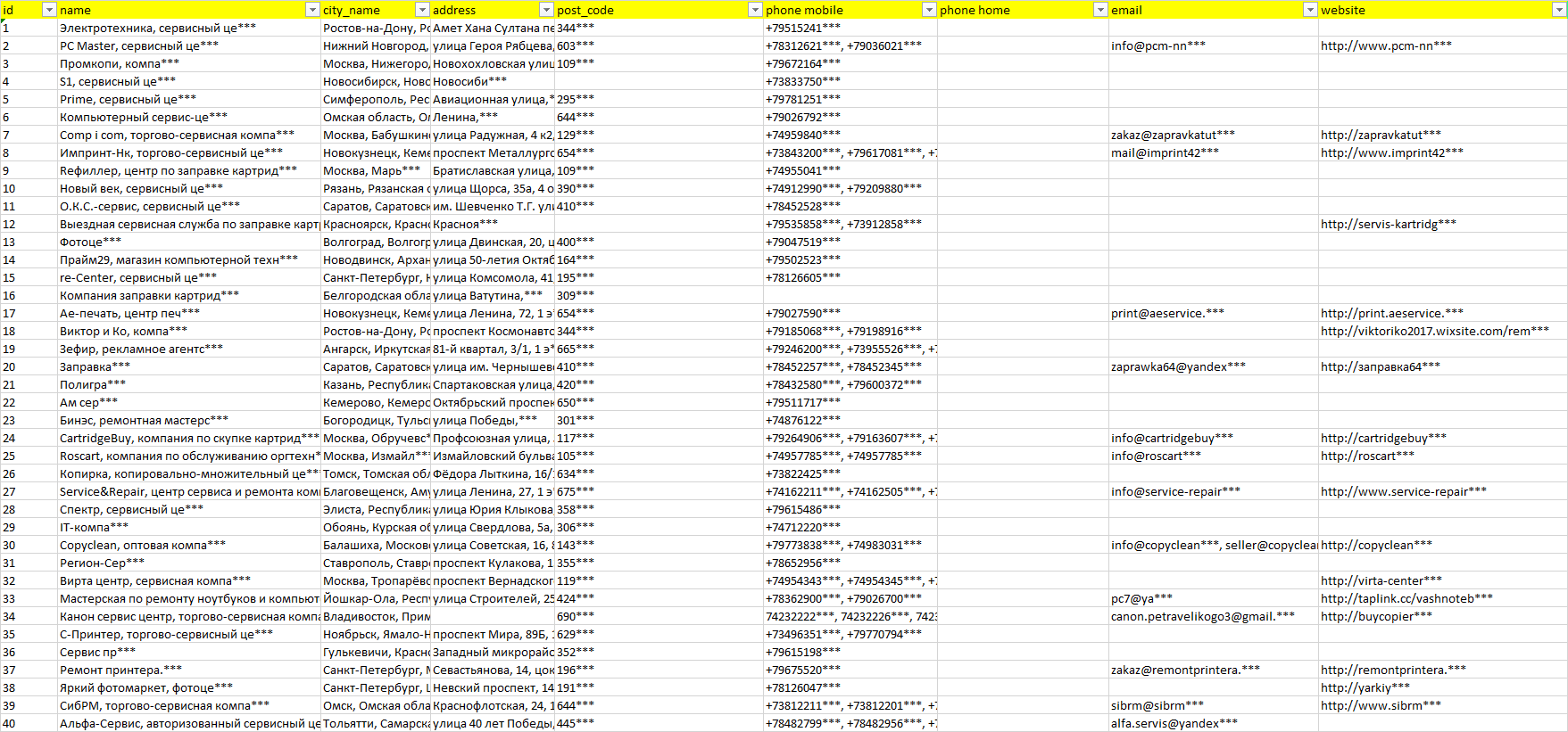 База организаций заправка картриджей, вся Россия в формате Excel с эл. почтами, телефонами, сайтами, ссылками на соц сети, координатами и другой информацией. Скачайте демо версию, чтобы ознакомиться с данными.