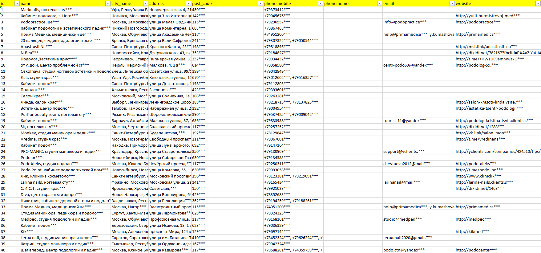 База компаний подолог, вся РФ в формате Excel с эл. почтами, телефонами, сайтами, ссылками на соц сети, координатами и другой информацией. Скачайте демо версию, чтобы ознакомиться с данными.