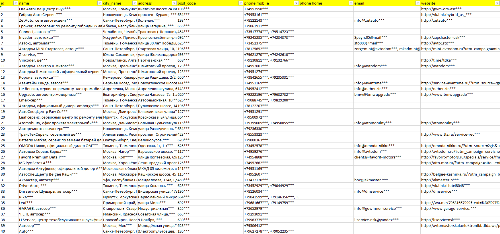 База организаций ремонт электроавтомобилей, вся Россия в формате Excel с эл. почтами, телефонами, сайтами, ссылками на соц сети, координатами и другой информацией. Скачайте демо версию, чтобы ознакомиться с данными.